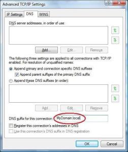 - On the VPN client’s network adapter, under TCP/IP properties, advanced, DNS, you also need to add the domain DNS suffix, such as MyDomain.local in the “DNS suffix for this connection” box.