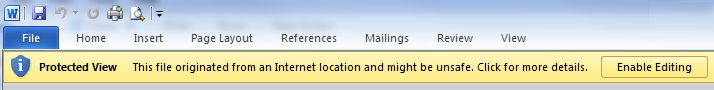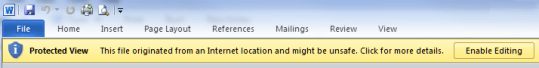 When opening Office 2010 documents such as Word and Excel using a VPN client, you will receive a warning on the menu bar which reads; ” Protected View This file originated from an Internet location and might be unsafe. Click for more details. Enable Editing”.