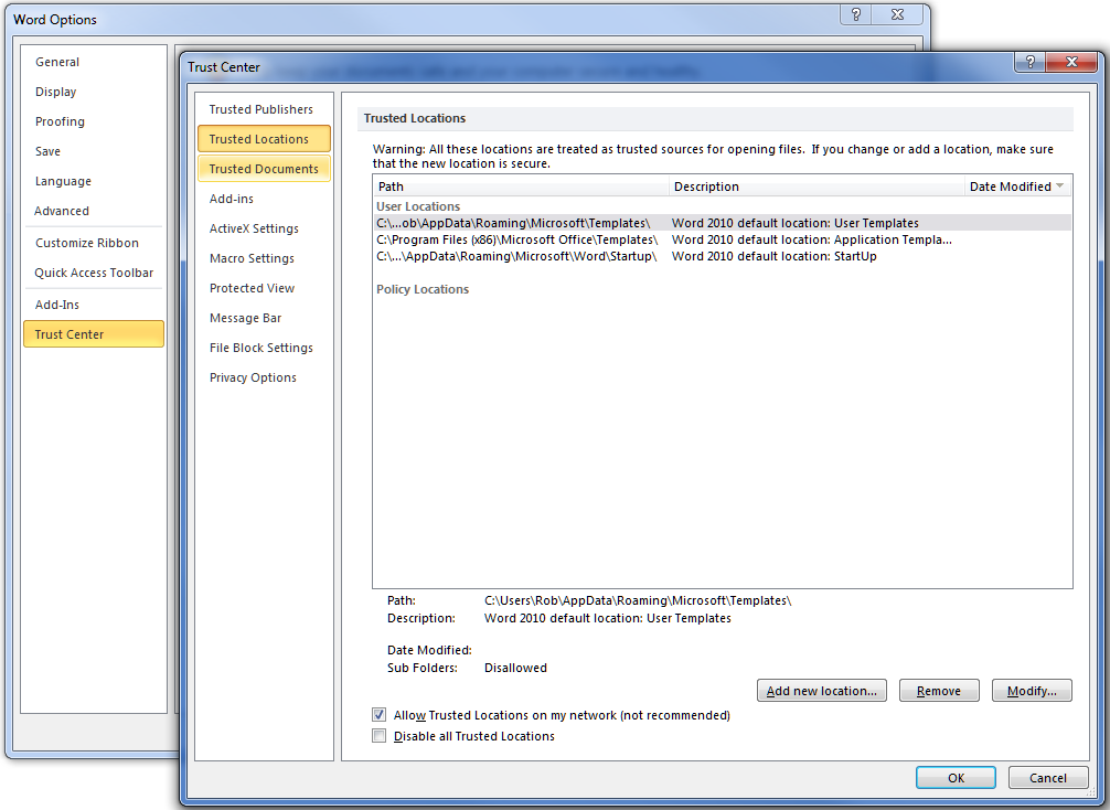 Microsoft has provided options to add trusted network locations within the trust center in Word, Excel, and other Office 2010 applications, which also requires checking “allow trusted Locations on my network”. However it does not accept using IP addresses such as \\192.168.123.123\ShareName. You can use the UNC path but that also requires proper name resolution be set up for DNS.