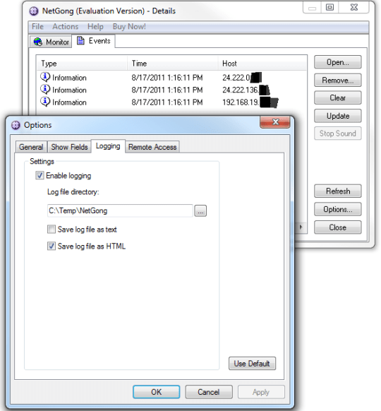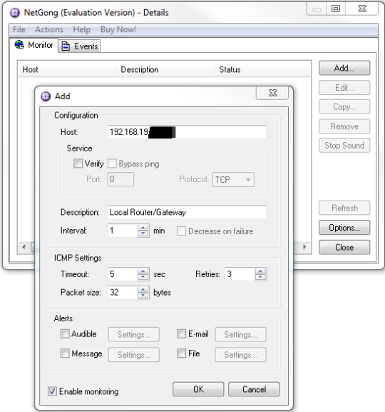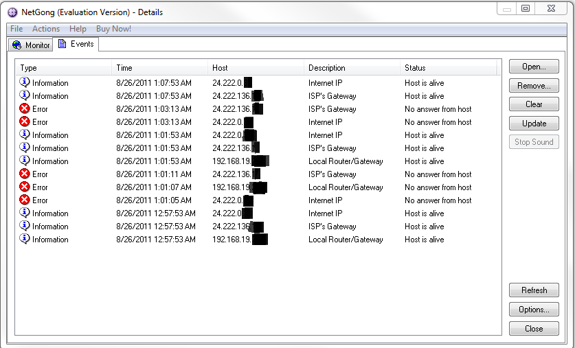 Netgong, formerly IPMonitor, is a simple little tool that can be helpful in documenting disconnects. It is really nothing more than a fancy ping tool with logging, but that log can be very useful when diagnosing connections from a PC to the Internet, Virtual Private Networks, or within a LAN through various routers. Basically any connection involving multiple network segments.