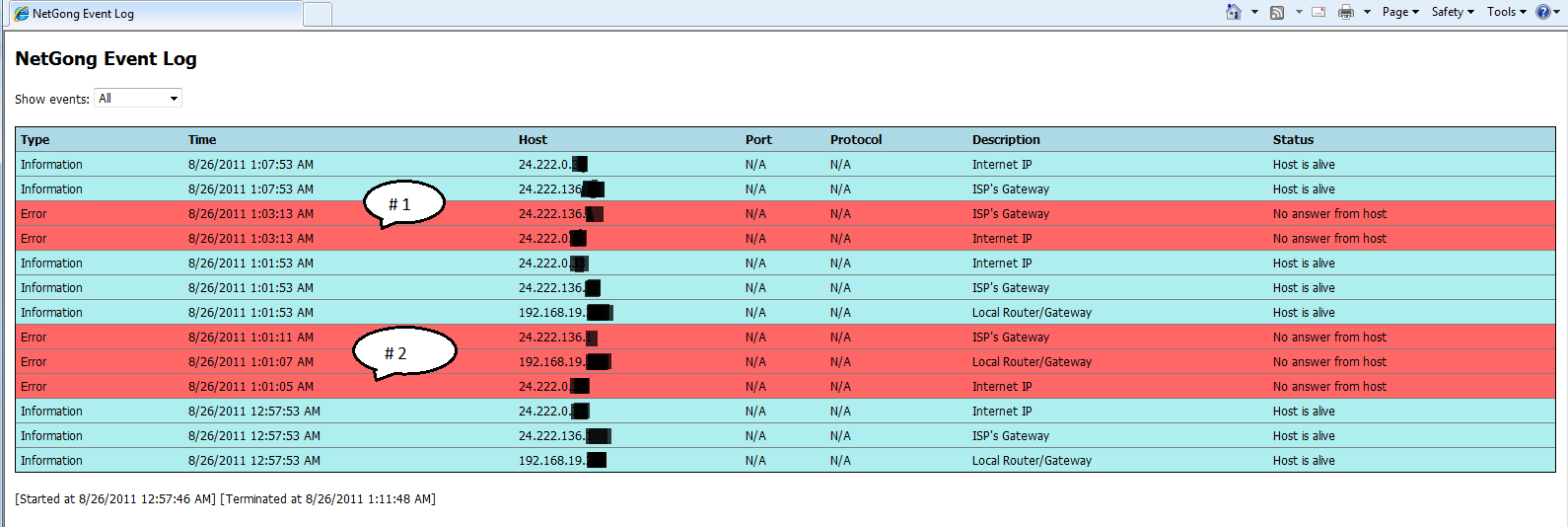 The next image is a sample Html log file. Item #1 indicates the ISP’s gateway (modem) and Internet were unavailable but the router could be pinged, showing the connection was lost between the local router and the ISP’s modem. Item #2 shows all 3 IP’s unavailable indicating a loss of connectivity between the client and local router.