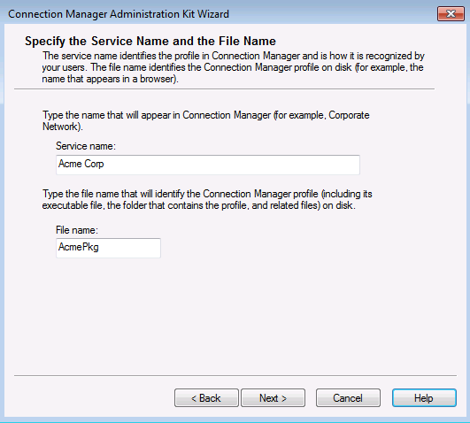 Accept the defaults in the remaining windows; “Display a Custom License agreement” and “Install Additional Files…”.  In the final Window “Build the Connection Manager Profile and its Installation Program” leave Advanced uncheck, and assuming you do not wish to make any changes, click Next, and Finished.  The deployable package will be saved in a folder named profiles in the CMAK folder, the default location being: C:\Program Files\CMAK\Profiles\Windows 7 and Windows Vista\   You only need to copy the .exe file to the client computer, in this case AcmePkg.exe