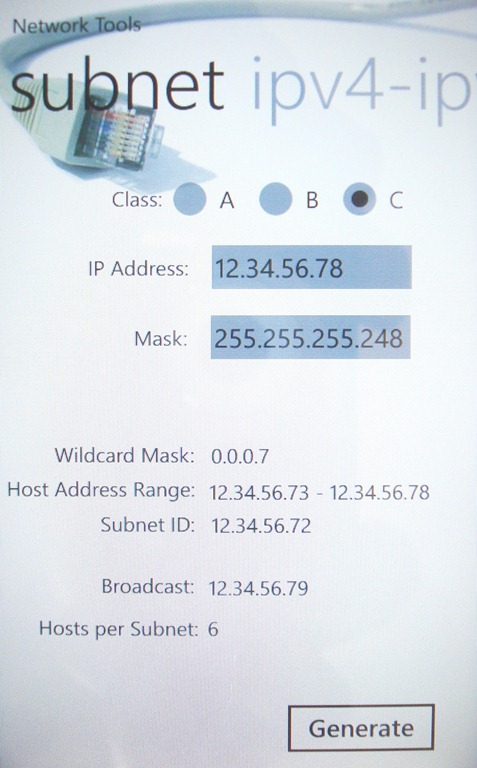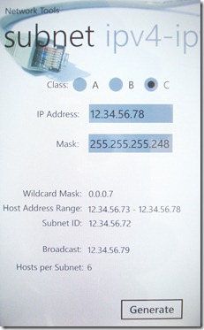 You can certainly do manual calculations using binary numbers like 00001100.00100010.00111000.01100100, or with the Internet readily at hand you can use subnetting calculators. I recently stumbled on a great little free app for Windows Phone 7 called Network_CalculatorV2. It is a very handy tool to have in your pocket the few times you might need it rather than searching the internet for that site you found last year, but can’t seem to find now. It will also do pings to IP’s and DNS names, but it is the network calculator that I found particularly useful and simple to use.