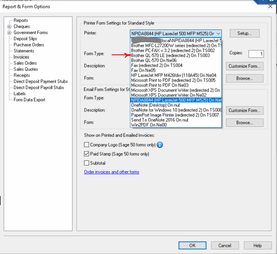 If you remote into a PC to run Sage, sometimes your local printer does not connect. To resolve this you need to open the Windows printers console on the computer running Sage and look for the appropriate printer and the “redirected #”. Then in Sage under Report & Form Options, choose the items you wish to print and beside them select the printer with the redirected # that matches the printer in the Windows printers console, as in the image below.
