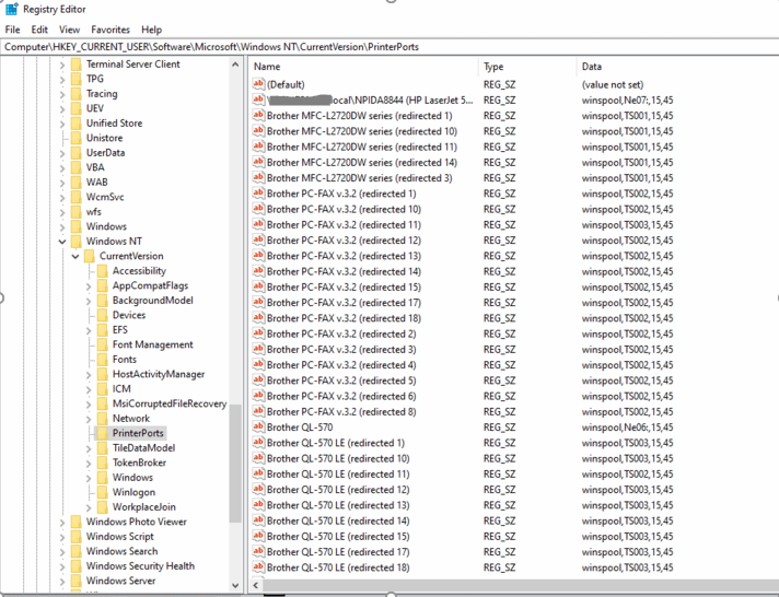 HKEY_CURRENT_USER\Software\Microsoft\Window Nt\Currentversion\Printerports