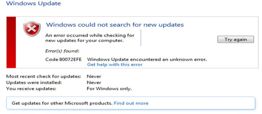 I had to do a clean install of Windows 7 on an old PC for reasons I will not go into. After installing Win7 SP1 and a couple of drivers I ran Windows update but it failed almost immediately with Error / Code 80072EFE “Windows Update encountered an unknown error.”