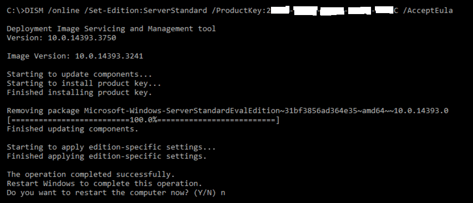 DISM /online /Set-Edition:ServerStandard /ProductKey:XXXXX-XXXXX-XXXXX-XXXXX-XXXXX /AcceptEula