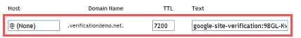 Before Google will activate your new Google Apps account it understandably needs to verify domain ownership. There are several ways to do so relating to your web site but if you do not have a website for your domain, you are limited to adding a DNS record with whomever manages DNS for your Domain. In the past Google requested you create a Host [A} record, but a year ago they switched to using Txt records. The Google instructions are simple and straight forward, you just enter a lengthy 68 character text string in the “Text” box and then either leave the “Host” box empty or enter an @ symbol.  (see: http://www.google.com/support/a/bin/answer.py?answer=183895 )image
