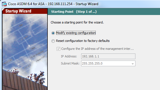 Launch the ASDM using https://192.168.1.1 , choose to ignore the certificate error, and select “run Startup Wizard”. When prompted for a username and password leave both blank. You can also start the wizard from within the ASDM from the menu under Wizards, Startup Wizard.