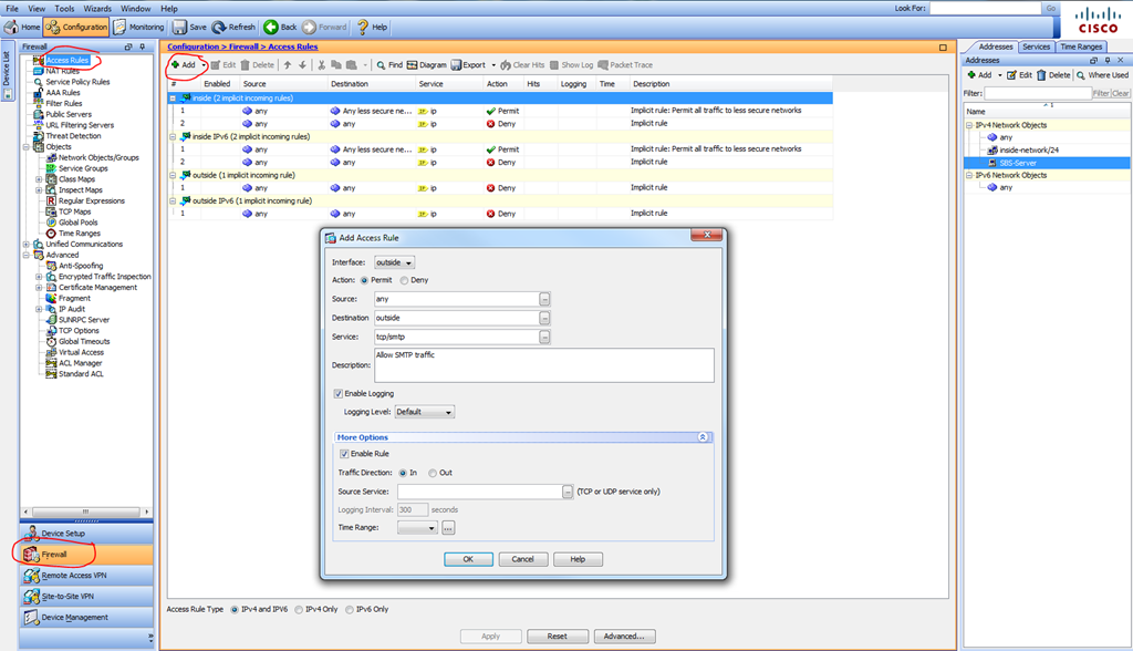 Add an Access Rule:  Next, again in the firewall section, Navigate to Access Rules | Add | Add Access Rule.  Change the Interface to Outside, the Source will be “any”, Destination the outside interface, Service can again be selected from the drop down list, and add a description if you like.  Leave the “More Options” section set to defaults. Click OK and Apply.