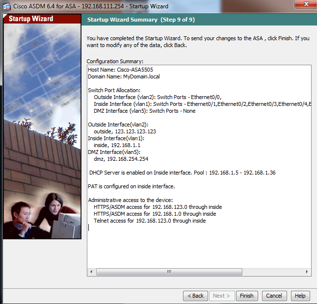 Following is an outline as to how to configure a Cisco ASA 5505 for an SBS 2008/2011 network, including basic router configurations, IP addressing, and port forwarding, using the GUI/ASDM. The ASDM version used at the time of writing is 6.4(5), and ASA Version 8.2(5).  For the record this can be accomplished much more easily from the CLI/Command Line Interface, but we SBS folk tend to like to do things from a GUI.  I will however post a follow-up article outlining how to do so from the CLI, using only a handful of commands. [Updte: for CLI instructions see: https://blog.lan-tech.ca/2012/01/25/configure-cisco-asa-for-sbs-20082011-network-using-cli/ ]