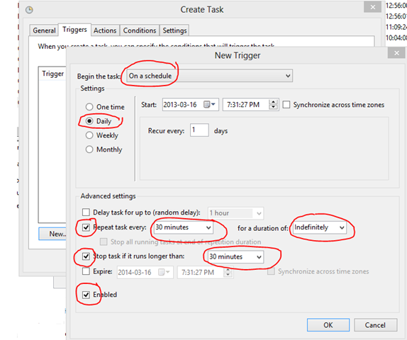 Finally, you need to schedule a task to run the batch file every half hour (or your time frame). The following is an example as to how to do so with Vista/Server 2008 and newer. Similar can be done under Control Panel, Scheduled Task in XP/Server 2003 and earlier.