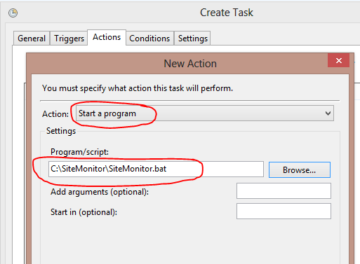 To configure simply create a folder such as C:\SiteMonitor and place in it; the batch and VBS script below, and http-ping . You will have to download http-ping from http://www.coretechnologies.com/products/http-ping/