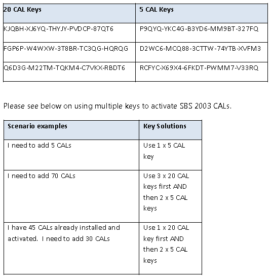 A product key can only be used once to activate the designated number of CALs for that given key. Therefore a combination of keys may need to be used to activate all of your 2003 CALs. We have provided 3 keys that will activate 5 CALs each and 3 keys that will activate 20 CALs each. This is so customers can activate anywhere from 5 to the maximum number of 75 CALs supported with SBS 2003. It is recommended that you use the 20 CAL Keys first and then use the 5 CAL keys to avoid a situation where adding the 20 CAL key(s) last may put you over the 75 CAL limit when you have existing CALs.