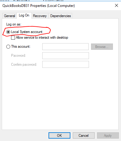 Double click on the service to open the properties for that service and click on the “Log On” tab. The radio button “This Account” will be checked, a QBDataServixeUserxx” name will be shown, and a hidden password entered. Change to “Local System account”, click apply and close, then right click on the service and choose start. (NOTE: if you change this setting to service account and want to change back for some reason you will likely need to re-install QuickBooks)